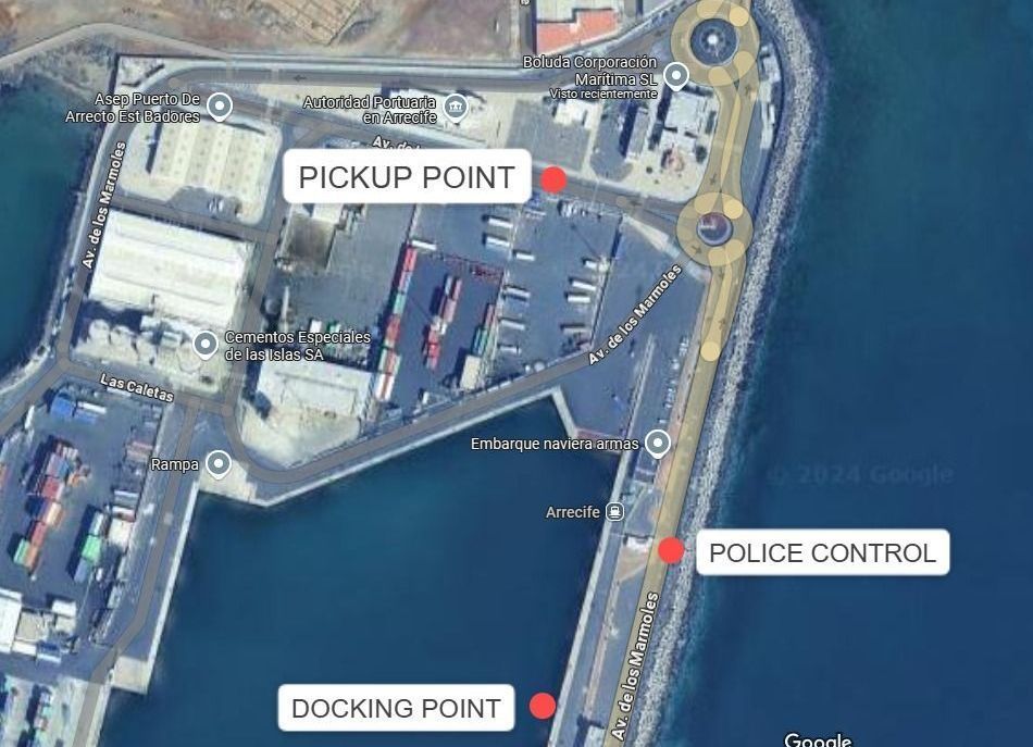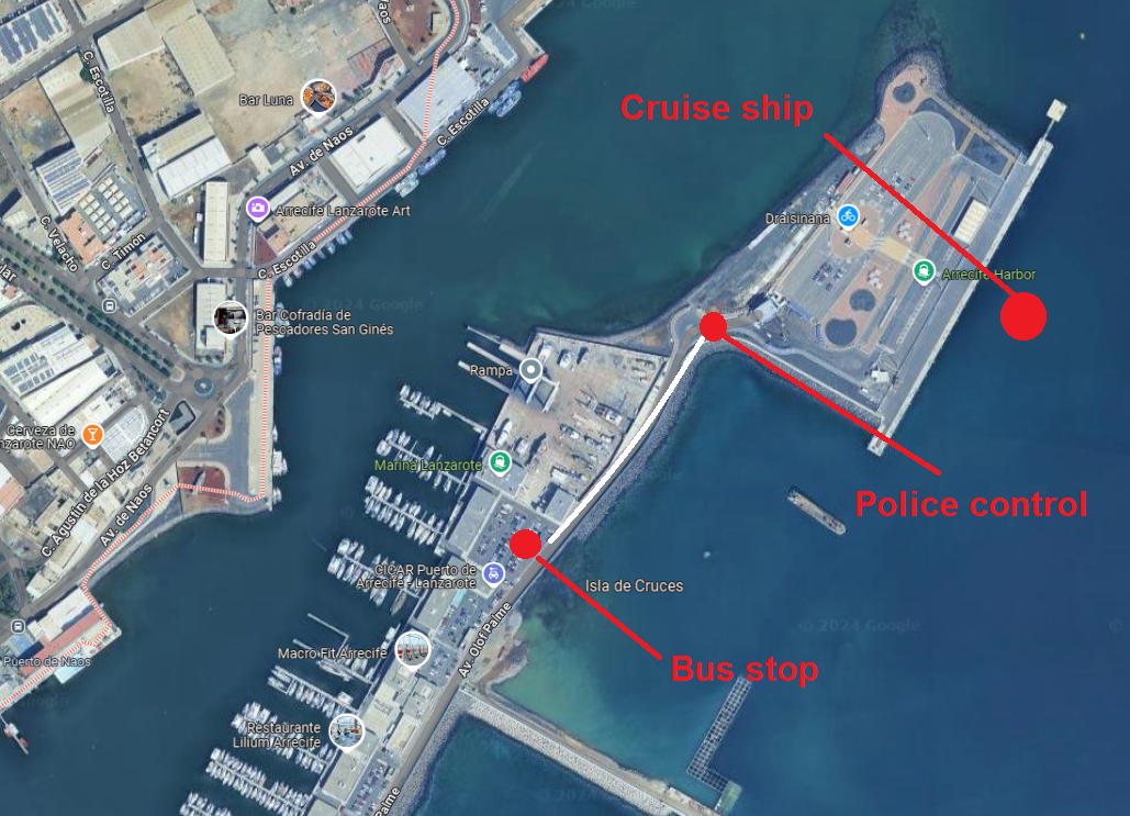 Recogida en el Puesto del Control Policial del puerto en donde atraque el crucero, ya sea en Los Mármoles o Muelle de Cruceros.
